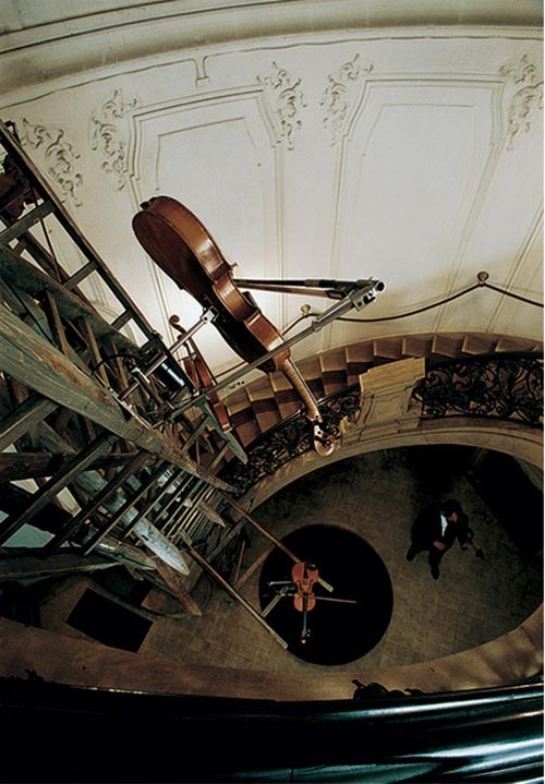 Found objects and self-constructed items such as violins, suitcases, batons, ladders, pianos, metronomes, feather fans, small metal hammers, black water basins, space-connecting spiral drawing devices, large funnels, and pumping stations form the building blocks of kinetic sculptures that are released from their defined materiality and transformed into an immaterial metaphorics of constant transformation. In this way, they offer the viewer the possibility of associating mythical images and establishing links to cultural history, literature, and intellectual traditions.