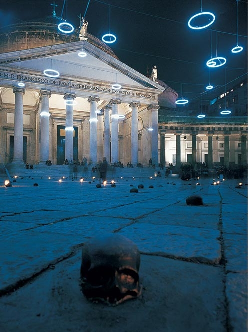 In later works, atmospheric energies such as sound structures or voices are transformed into a new immateriality of space. Examples include Moon Mirror (Palma de Mallorca, 2003), the outdoor installation Spiriti di Madreperla (Naples, 2002), and Light Imprisoned in the Belly of the Whale (2002).